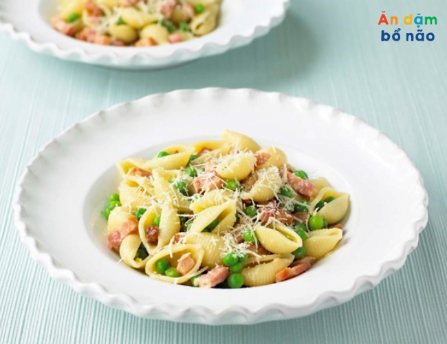- Khi thịt chín, cho mì vỏ sò và đậu hà lan vào đảo đều. Cho phô mai parmesan vào để tạo vị mặn tự nhiên cho món ăn.
